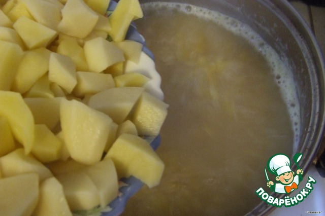 Тем временем нарезать картофель небольшими кубиками. И также выкладываем в кастрюлю.