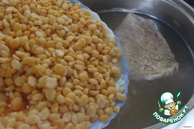 Сухой горох залить холодной водой и оставить для набухания примерно на 3 часа.