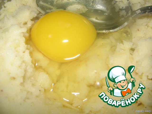 Даём немного остыть. Добавляем яйцо, вмешиваем его (как в заварное тесто, пока не вмешается полностью).