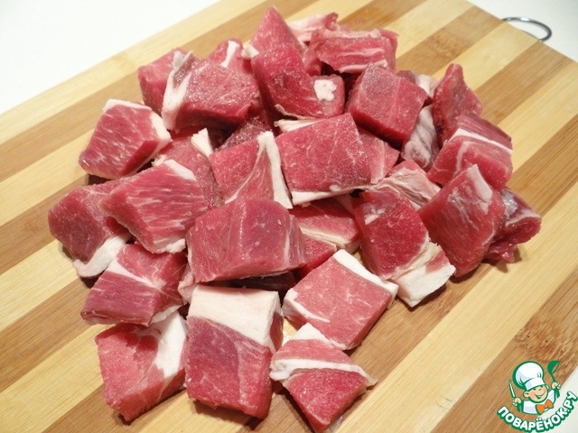 Сначала подготавливаю все ингредиенты. Мясо мою, нарезаю на небольшие кубики.