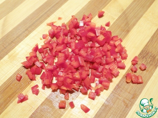 Перец красный жгучий очищаю от семян, мою и нарезаю на маленькие кубики.
