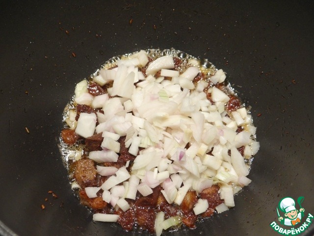 В казане нагреваю растительное масло, добавляю баранину и специи, хорошо обжариваю мясо.