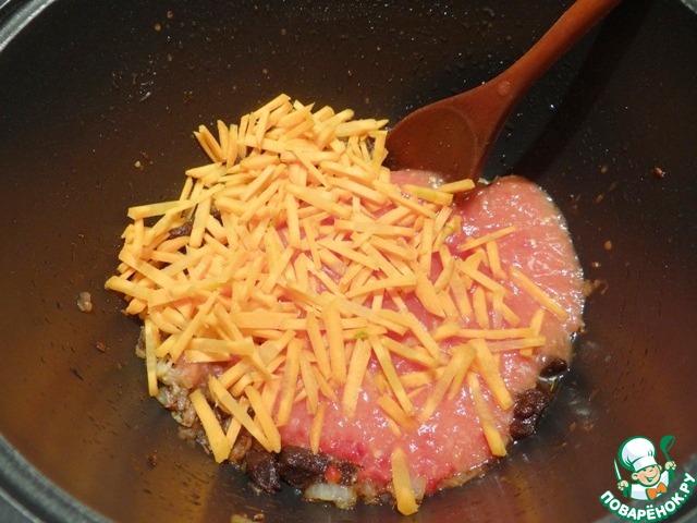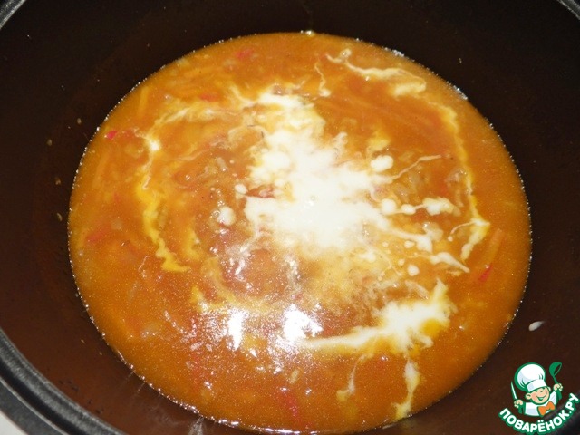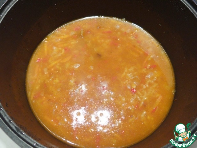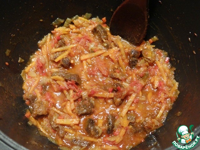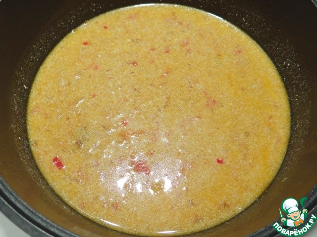 Добавляю пюре из помидоров, морковь, перец красный жгучий.