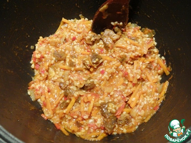 Обжариваю овощи с мясом до испарения лишней влаги примерно 12-15 минут, время от времени помешиваю.