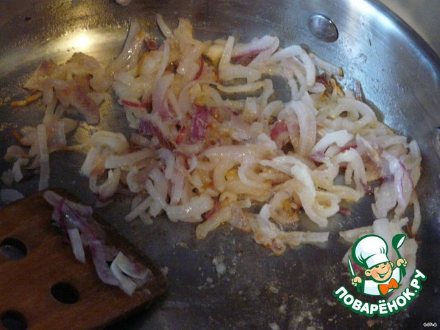 Лук обжарить до мягкости, добавить муку, жарить до слегка-коричневого цвета.