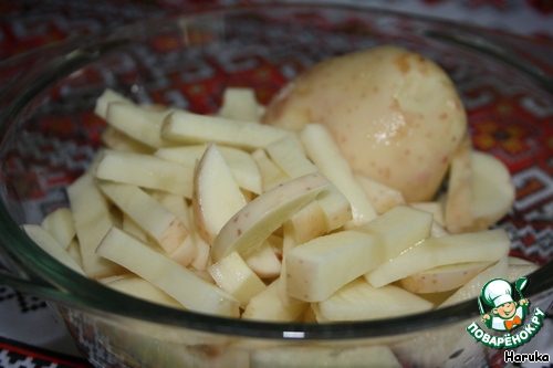 Для начала необходимо молодой картофель помыть, почистить и порезать соломкой или кубиками.