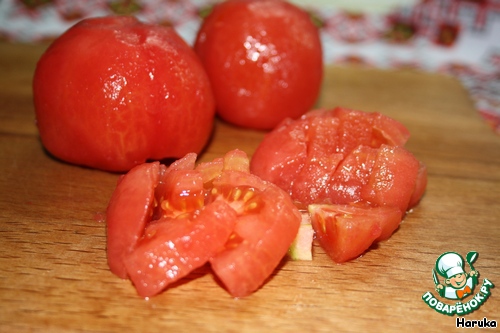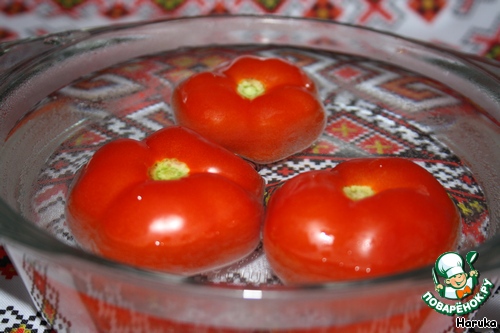 Тем временем помидоры залить кипятком на две минуты, затем вынуть из воды и очистить с них шкурочку.