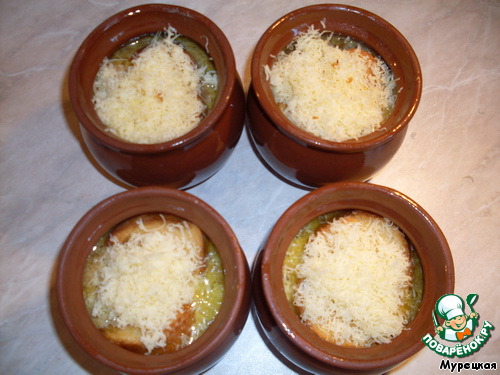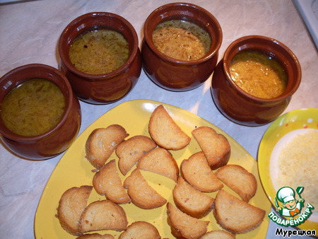 Суп разливаем по горшочкам, кладем в каждый пару-тройку (можно и меленькие сделать) гренок, обильно засыпаем сыром и снова запекаем в духовке при 220 градусах на гриле, пока сыр не расплавится и не потемнеет (можно и не ждать потемнения - я сильно запекшийся сыр не очень люблю).