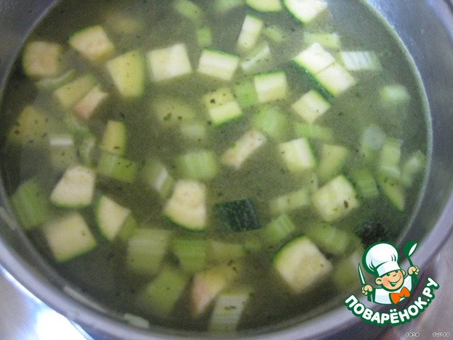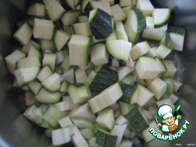 Кабачки, сельдерей черешковый, сельдерей корневой, лук репчатый нарезать кубиками,