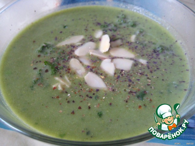 [b]для горячего[/b]: когда, после измельчения блендером перекипит - добавим сливки, доведем до кипения, разольем по тарелкам, посыпим зеленью и миндальными орехами.