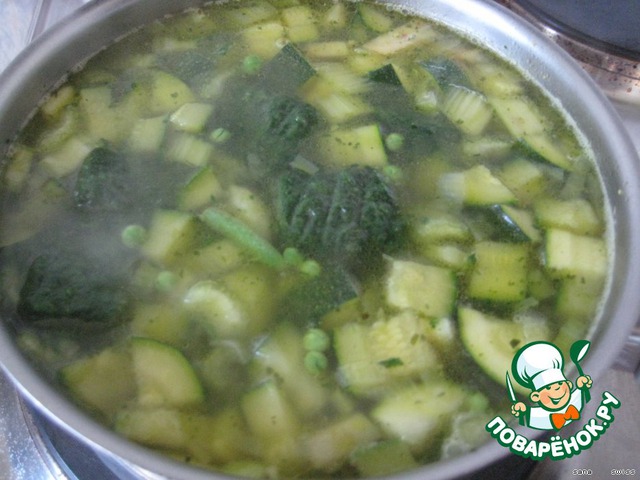 добавим замороженый горошек и шпинат и варим, с момента закипания, около 5-7 мин.