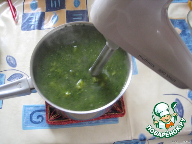 Поставим суп в прохладное место на полчаса для охлаждения, затем измельчаем его блендером,