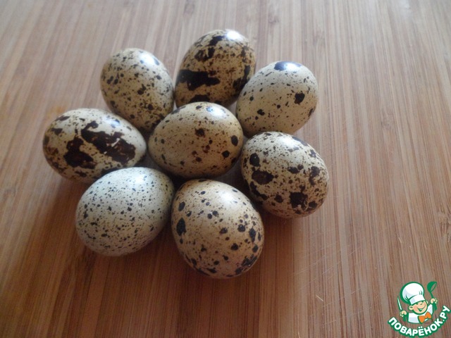 Отварить 8 перепелиных яиц до готовности и остудить в прохладной воде.