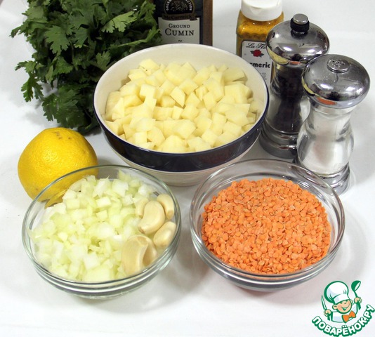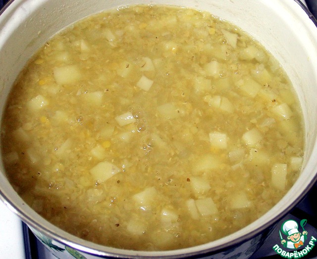 В кастрюлю наливаем воду (или бульон), кладем чечевицу, лук (мелко нарезанный), картофель (нарезанный на небольшие кубики) и чеснок (целыми зубчиками). Закрываем крышкой и доводим до кипения. Затем немного убавляем огонь и варим 15-20 минут - до готовности чечевицы и овощей.