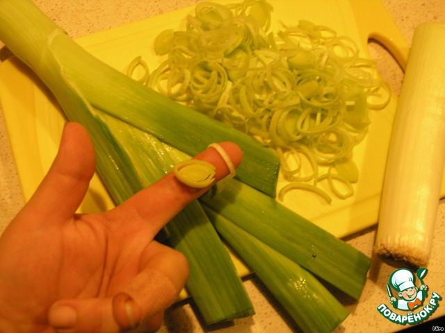 Вот так мы режем лук порей - тоненькими колечками.