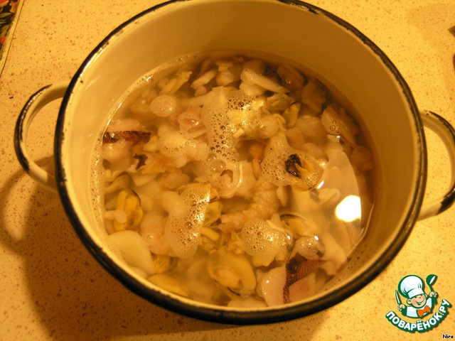 За это время у нас разогрелась плита и вскипел чайник. Вскрываем упаковку с морепродуктами, закидываем их в дуршлаг, очень быстро споласкиваем, насыпаем в кастрюльку. Заливаем кипятком где-то чуть выше половины. Это если они со льдом. Когда растают, тогда они воды и добавят. Если они "сухой" заморозки, воды доливаем так, чтоб их чть-чуть покрывало. Вот так, примерно