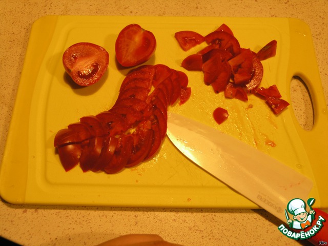 Вот так нарезаем помидор. Режем на четверти, удаляем плодоножку и тоненько шинкуем четвертинки. Снимать ли кожицу с помидора? Пожалуй, нет! Он, помидор, проведет в супе так мало времени, что кожица останется при нем. А если вы все-таки решите делать салат, так какой смысл снимать ее вообще?