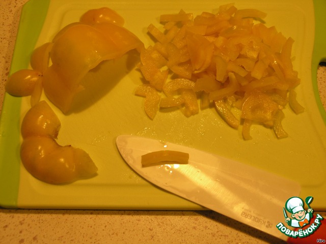 Вот так м режем перец, вынув из него семена и перегородки.
