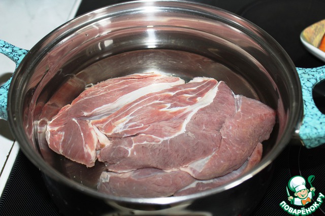 Мясо промыть, очистить от пленок, залить двумя литрами холодной воды, довести до кипения, снять пену. Варить на слабом огне полтора часа, затем остудить.