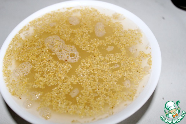 Пшеничную крупу промыть и замочить на час, затем воду слить.