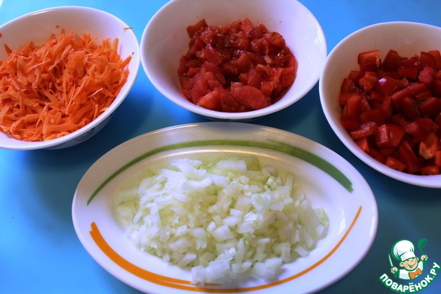 Займемся овощами. Лук мелко порубить, морковь натереть на терке, перец нарезать кубиками. Помидоры, после 3-х минутной бланшировки в горячей воде, очистить от кожицы и нарезать.