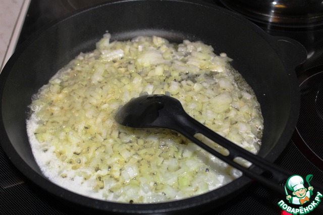 Лук положить на сковороду с разогретым маслом и жарить 1 - 2 минуты.