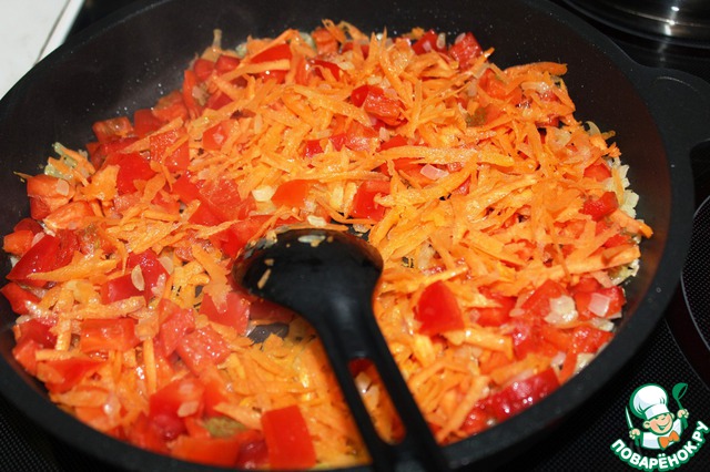 Добавить к луку морковь и перец, перемешать и готовить еще 2-3 минуты.