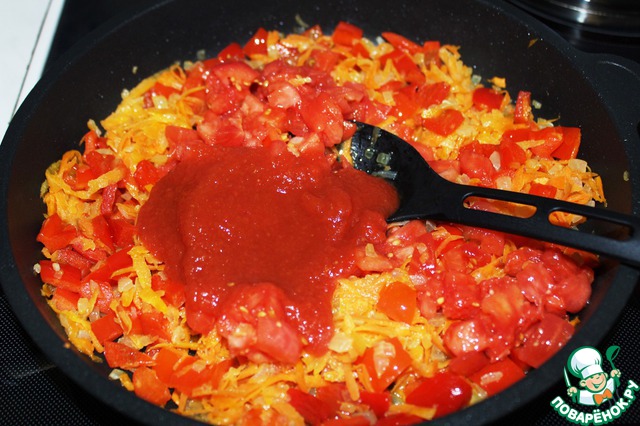 Затем добавить помидоры и томатную пасту, еще раз перемешать и тушить под крышкой 7 - 10 минут.