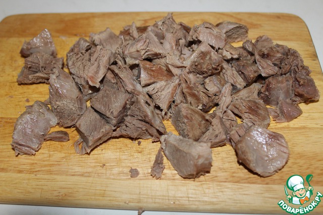 Мясо вынуть из бульона и нарезать небольшими кусочками. При необходимости бульон процедить.