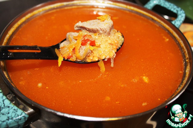В бульон добавить поджарку, мясо, пшеничную крупу, промытую чечевицу, и варить 40 минут.