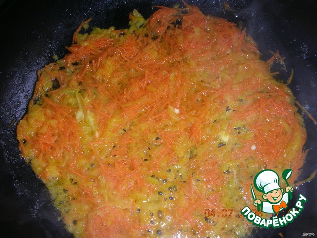 5.На сковородке растапливаем сливочное масло и обжариваем в нем морковку с перцем, после тушим под крышкой минут пять.