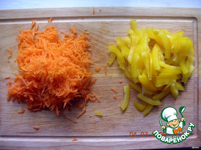 4.Морковку трем на мелкой терке и нарезаем желтый болгарский перец. (В последний момент передумала и натерла перец на терке (нарезанный перец тоже не пропал - пустила на салат)))))
