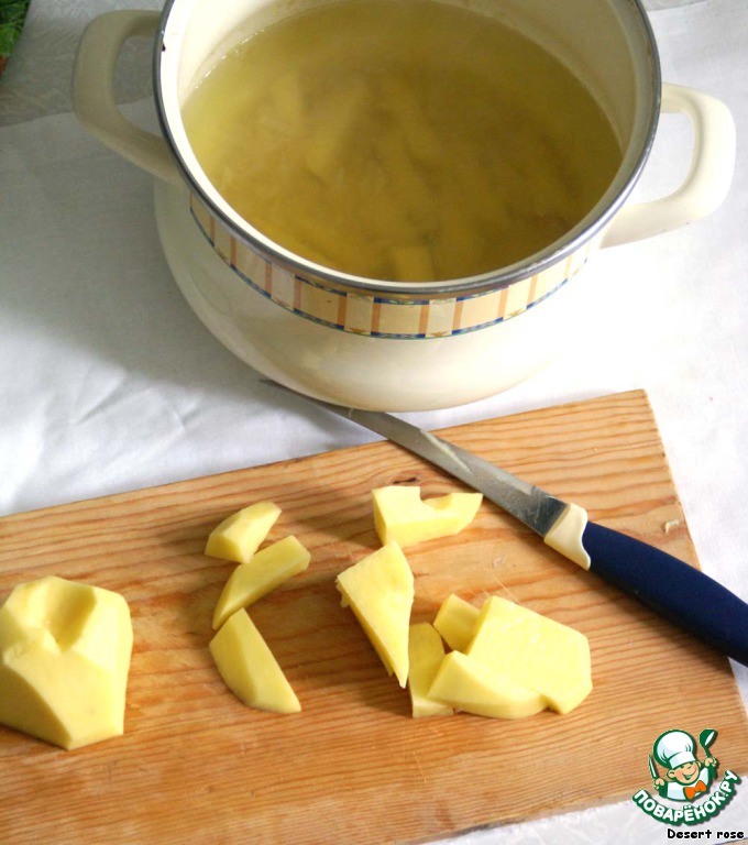 Добавить листик лавра и положить в бульон очищенный и промытый картофель, нарезанный брусками. Отварить его до готовности.