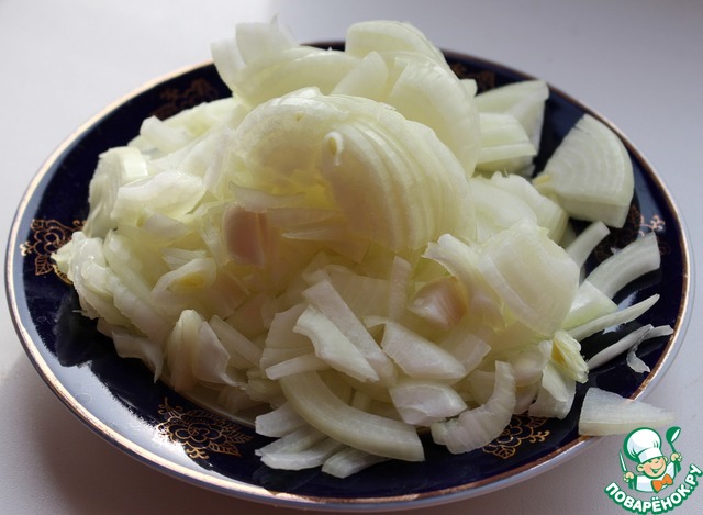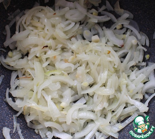Выложить нарезанный лук на разогретую с растительным маслом сковороду и тушить на медленном огне 10 минут. Сильно зажаривать лук не надо, он должен быть прозрачным!