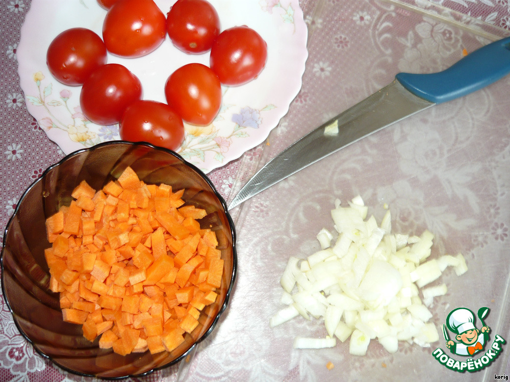Подготавливаем овощи. Все режем кубиком - лук, морковь, картофель. Помидоры режем на 4 части.