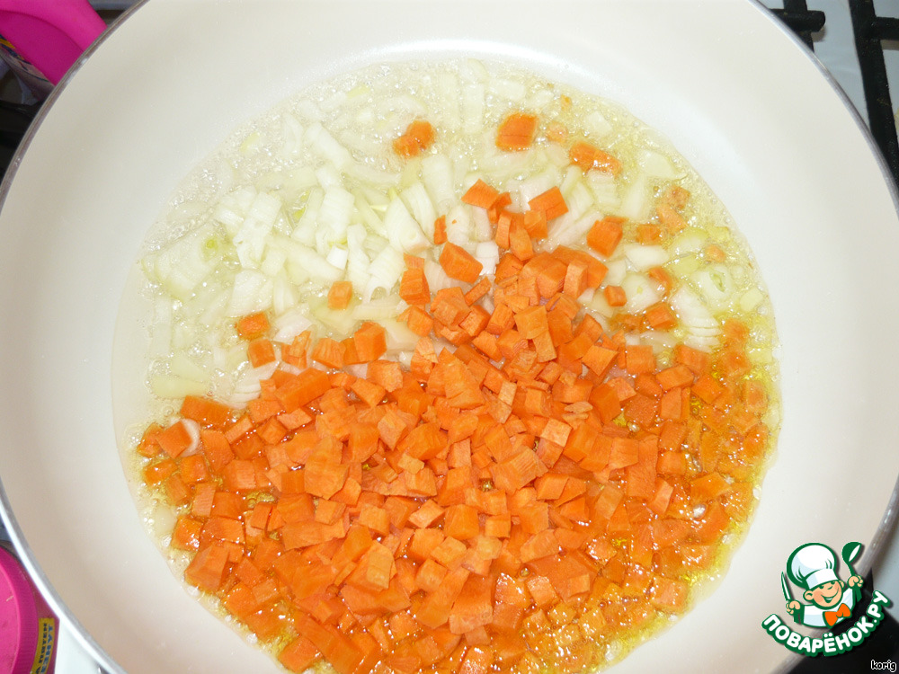 В разогретое масло добавляем лук, слегка обжариваем. Потом морковь.