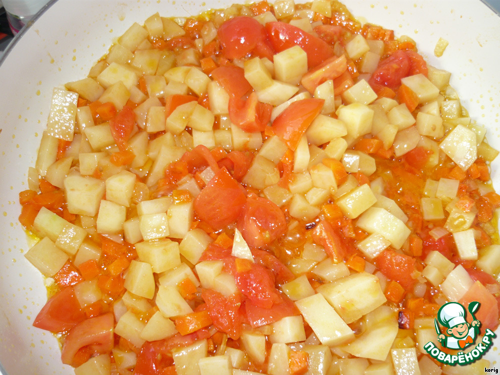 Затем кладем картофель и помидоры, все обжариваем.