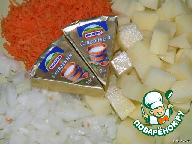 Плавленый сырок режем на части и добавляем туда же... *YES* Помешиваем пока он не растворится.