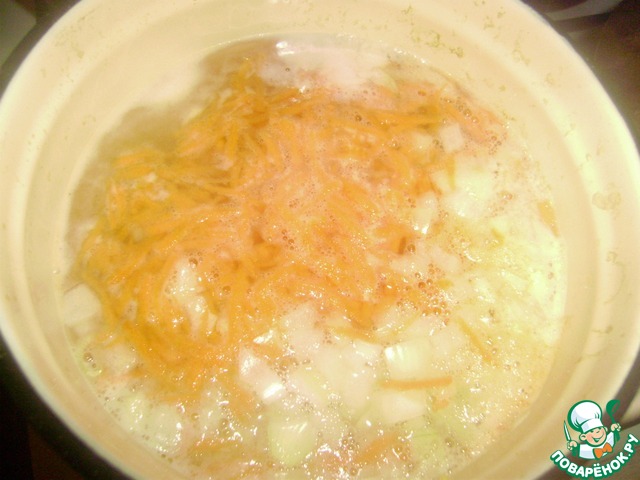 Лук с морковью добавить в кастрюлю к пшену и варить 10 минут. Посолить и поперчить.