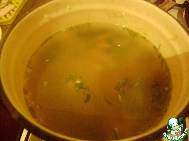 Через 10 минут добавляем зелень и чеснок. Снимаем с огня, накрываем крышкой и даем настояться 5 минут.