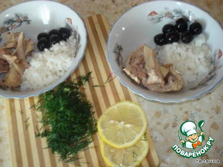 В тарелку накладываем по кругу: немного риса, мяска, кстати, в оригинале рецепт был без мяса, только на бульоне, но я готовила мужу на обед, а значит, надо было посытнее, маслинки. Заливаем всe это хозяйство бульоном и сверху выкладываем дольку лимона, любую зелень (у меня был только укроп) и ложечку сметаны. Подаем, не размешивая.