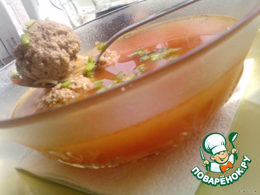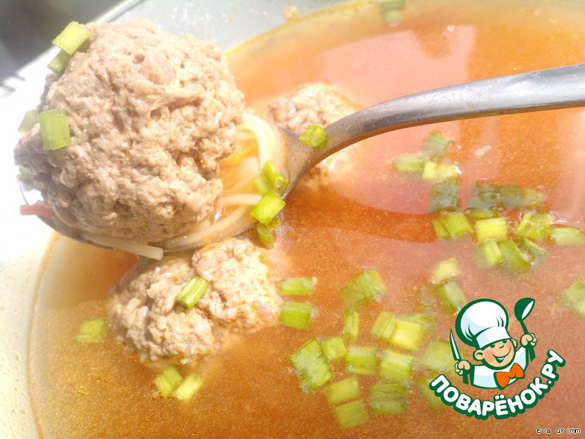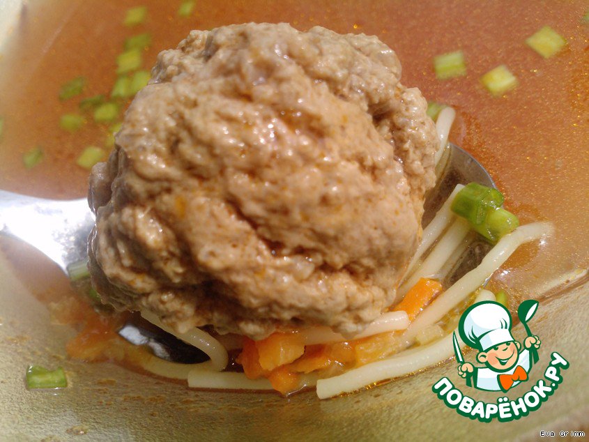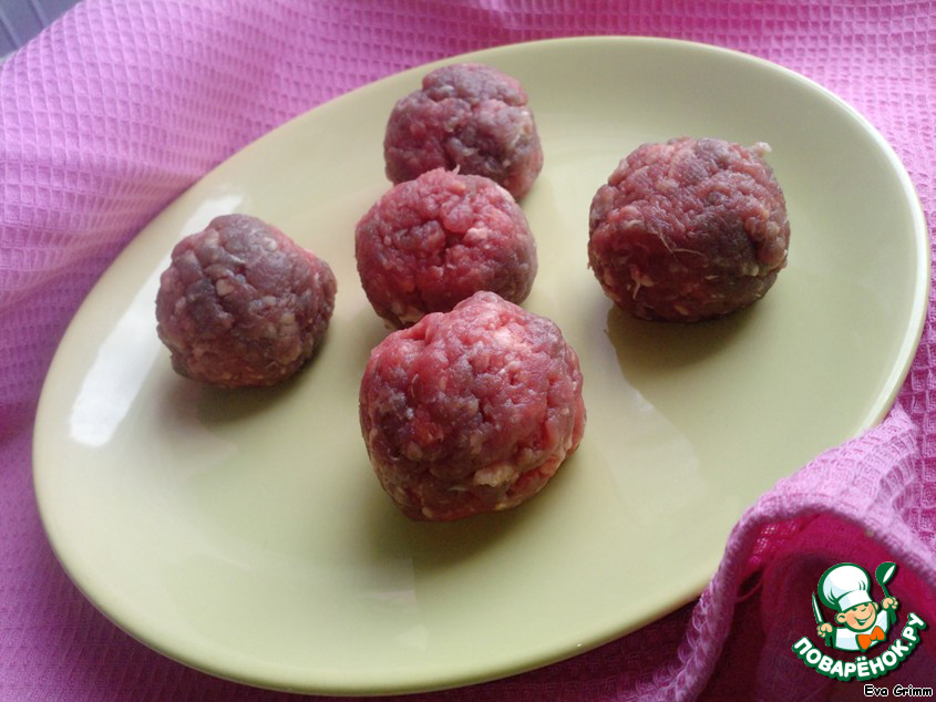Из фарша делаем 5 крупных фрикаделек. Больше они, конечно, по размеру на тефтельки похожи... но... как говорит мой папа :-D :-D :-D Закидываем в кипящую воду...