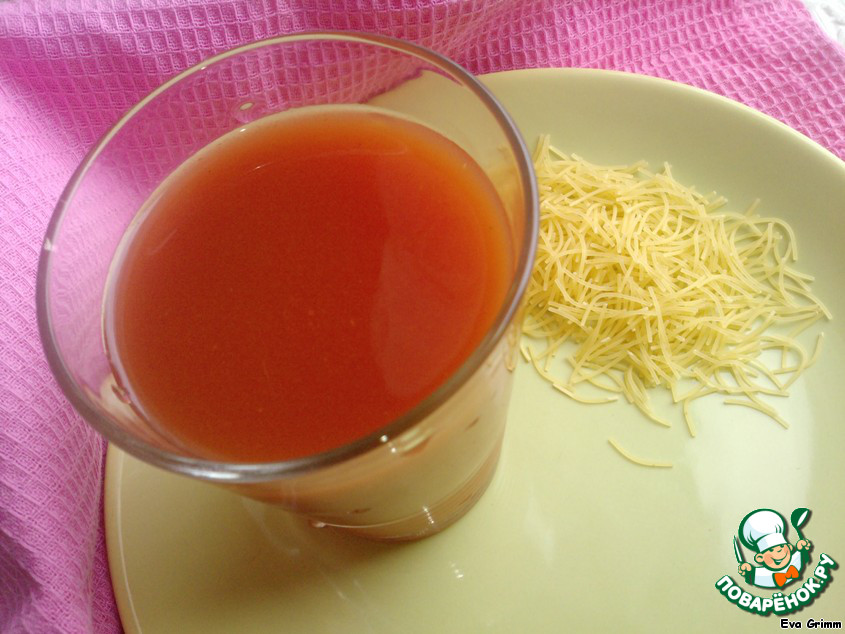 Туда же заливаем стакан сока от томатов и высыпаем горстку лапши.
