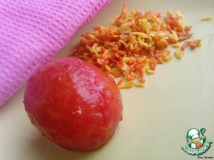 Один-два томата мелко режем и добавляем в бульон, зажарку отправляем туда же... "Крошку чеснок" не забываем.... Перед подачей посыпем зеленушечкой ;-)
