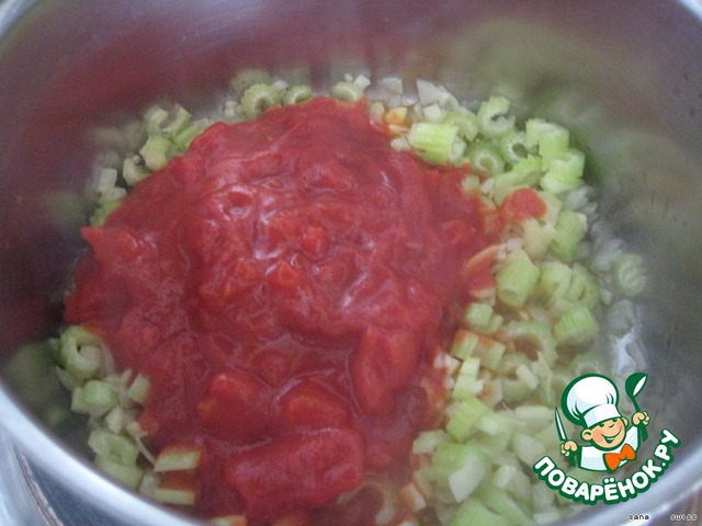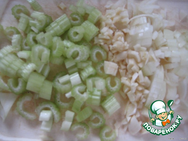 Лук, чеснок, сельдерей потушить в кастрюльке на масле около 5 мин.
