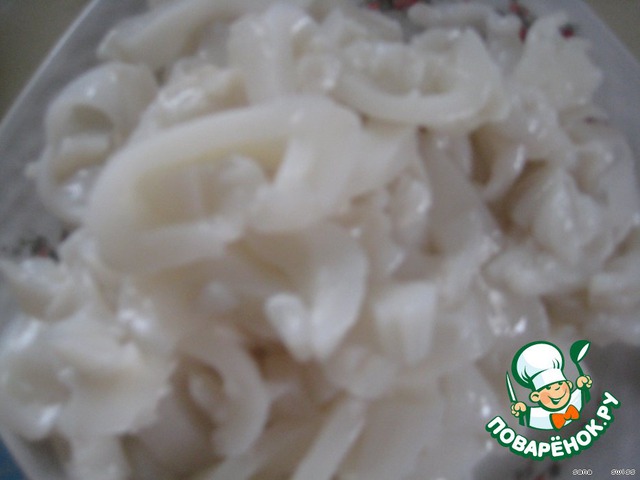 Добавить кальмары и зелень, закипятить, снять с огня.