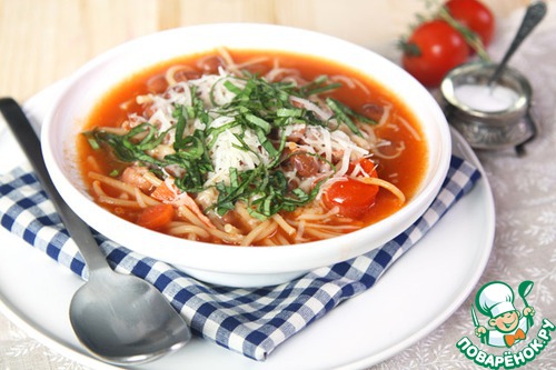 Готовый суп разливаем по подогретым тарелкам, посыпаем мелко порезанным базиликом, тертым пармезаном и при желании немного сбрызгиваем оливковым маслом.