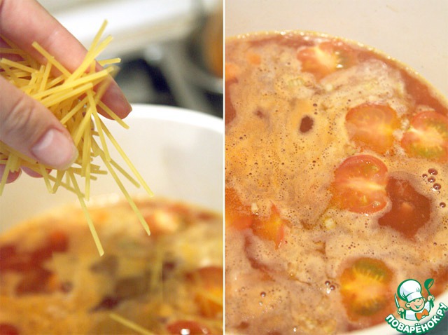 ... закинем поломанные спагетти и будем варить до готовности, около 10 минут (смотри инструкцию на упаковке). После этого выключим огонь, попробуем и добавим по вкусу еще соли и перца.