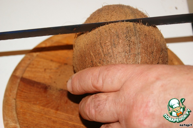 Распилить кокос, предварительно удалив из него сок. Подключаем вторую половинку.