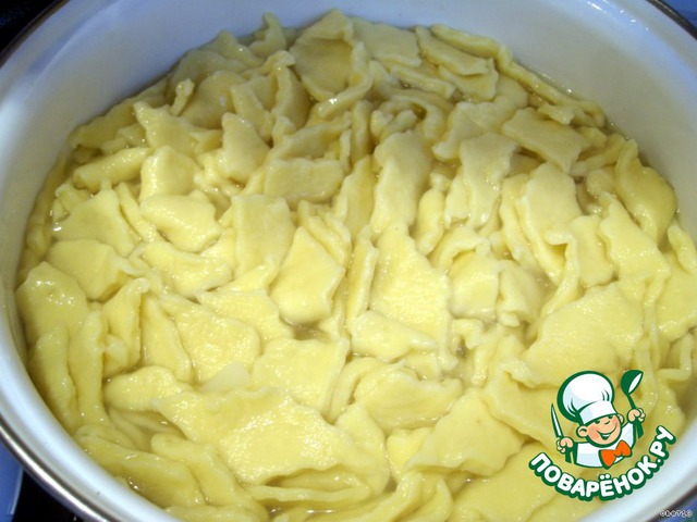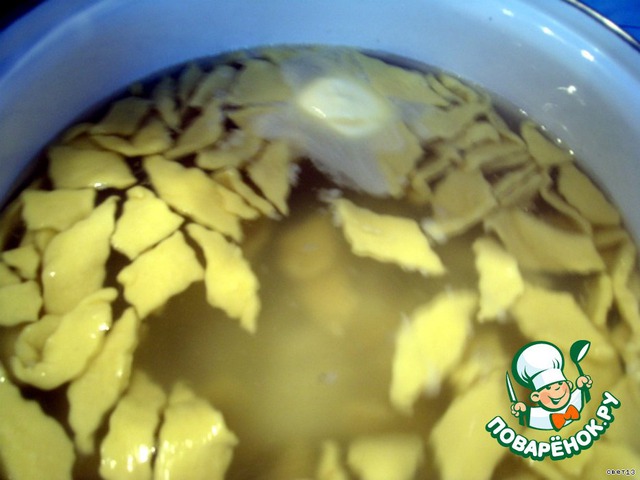 В полусварившуюся картошку добавляем наши мучные ромбики и кусочек масла.Помешаем,чтобы не слиплись.(Можно заменить ромбики макаронами-ракушками,тоже вкусно,но не так)